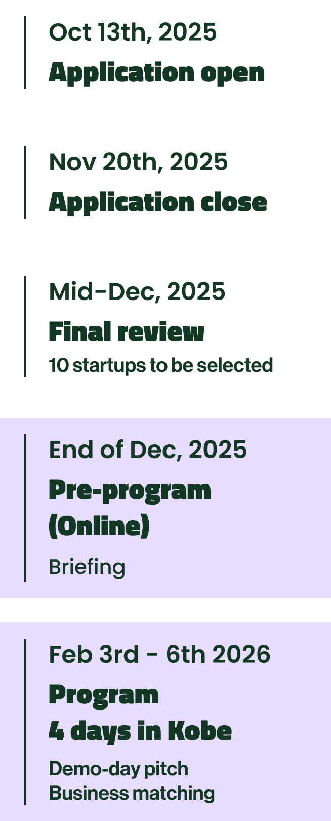 Started in 2023, Next Kitchen 2026 is a tailored mentoring and business-matching program for Foodtech startups worldwide that are looking to expand into Japan, beginning in Kobe – the City of Gastronomy.